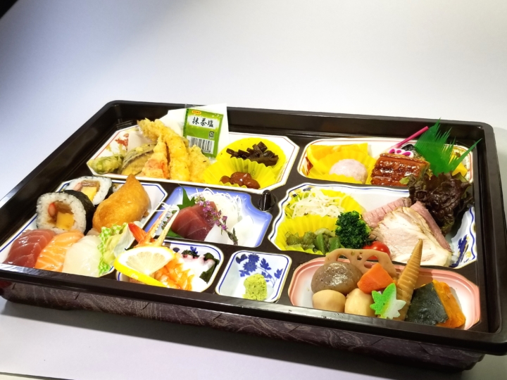 お刺身、天麩羅、煮物、寿司三種(江戸前、巻き、いなり)、ロースト二種(ビーフ、ポーク)、焼物三種(鰻、白身魚、卵)、酢の物(海老、カニ)、小付三~四種、フルーツ、スイーツ(和菓子)