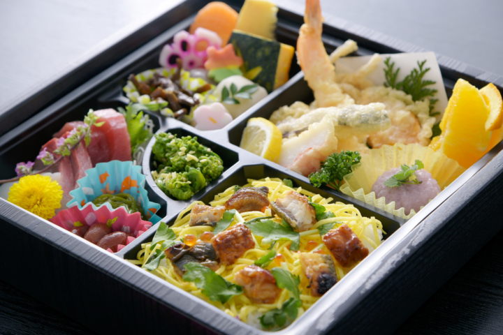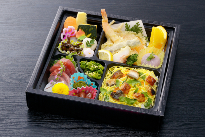 うなぎのひつまぶし御飯が大変に美味しいとご好評いただいている幕の内弁当です。他にもお刺身、天麩羅、煮物、お惣菜、スイーツとバランスよく盛り付けております。